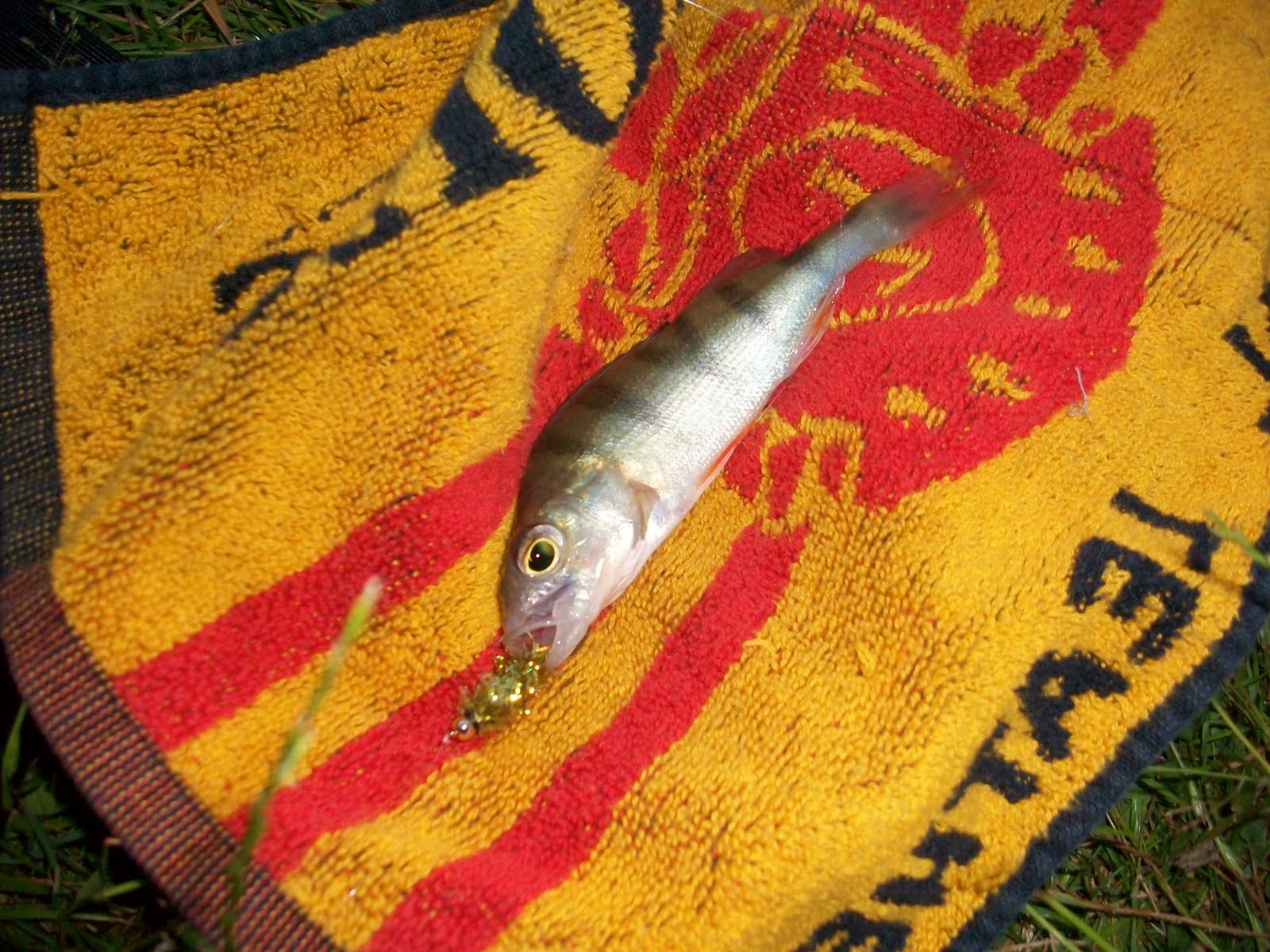 The light dimmed down and after no action or interest for a while I switched to a green damsel fly with a tinsel top and had a crack at Perch. On my third cast I hit in to the whopper you see below. This was new species #2 of the night.