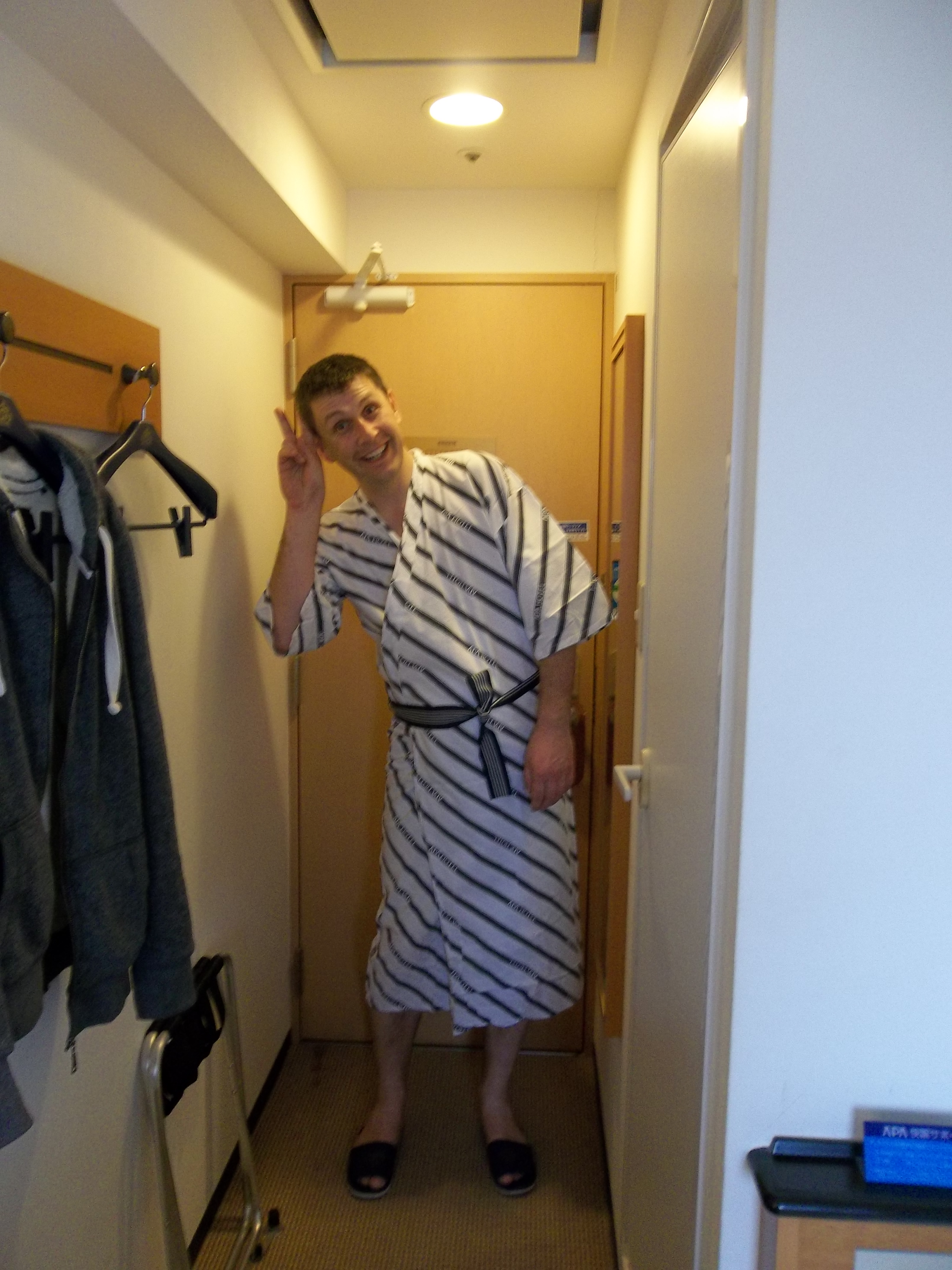 We checked in and headed up to the room which was a massive 9m2!! But it had a compact bath room, compact bed and compact floor space to move around on. There was a lovely paper crane on the bed and gowns to wear.